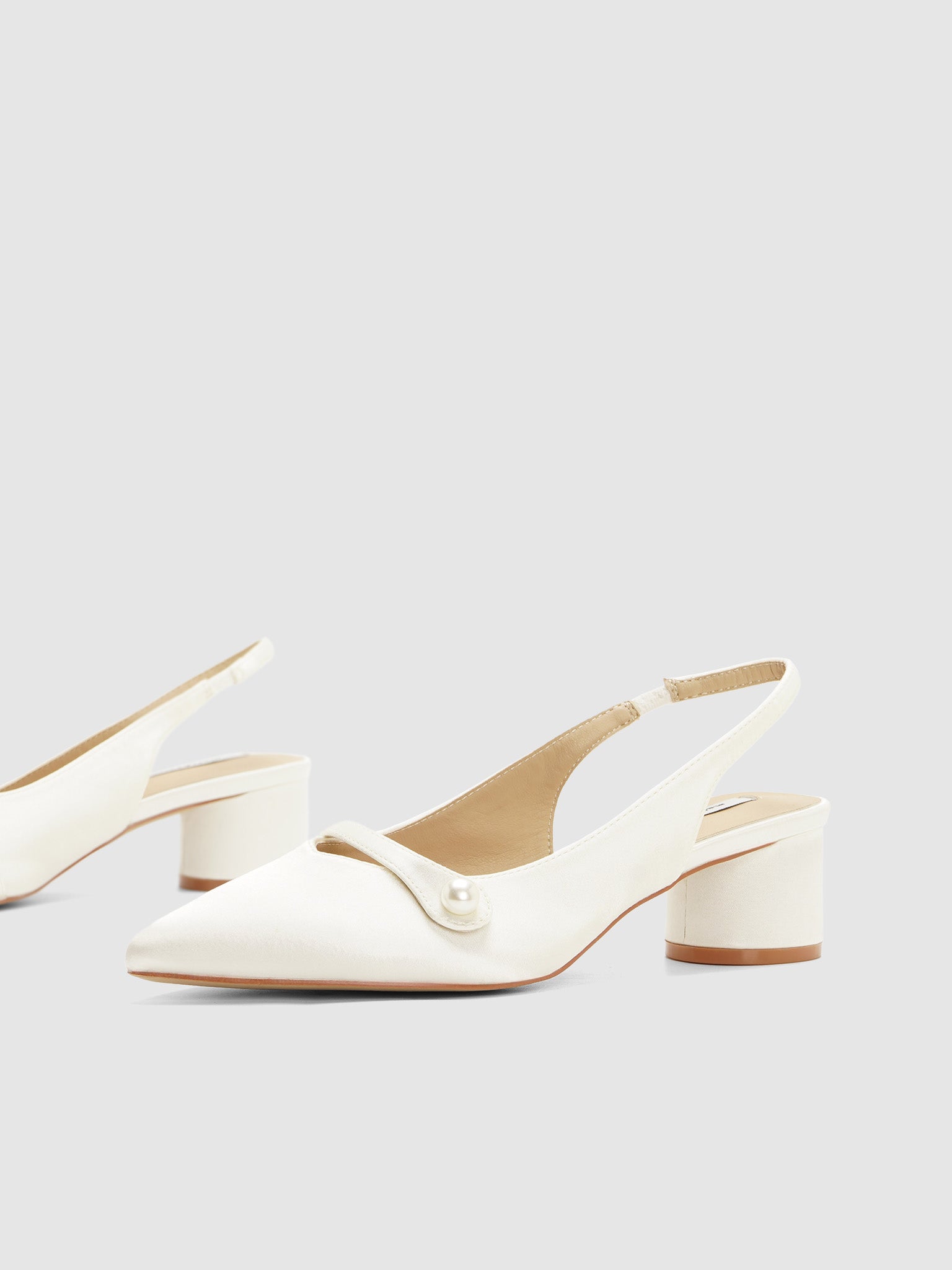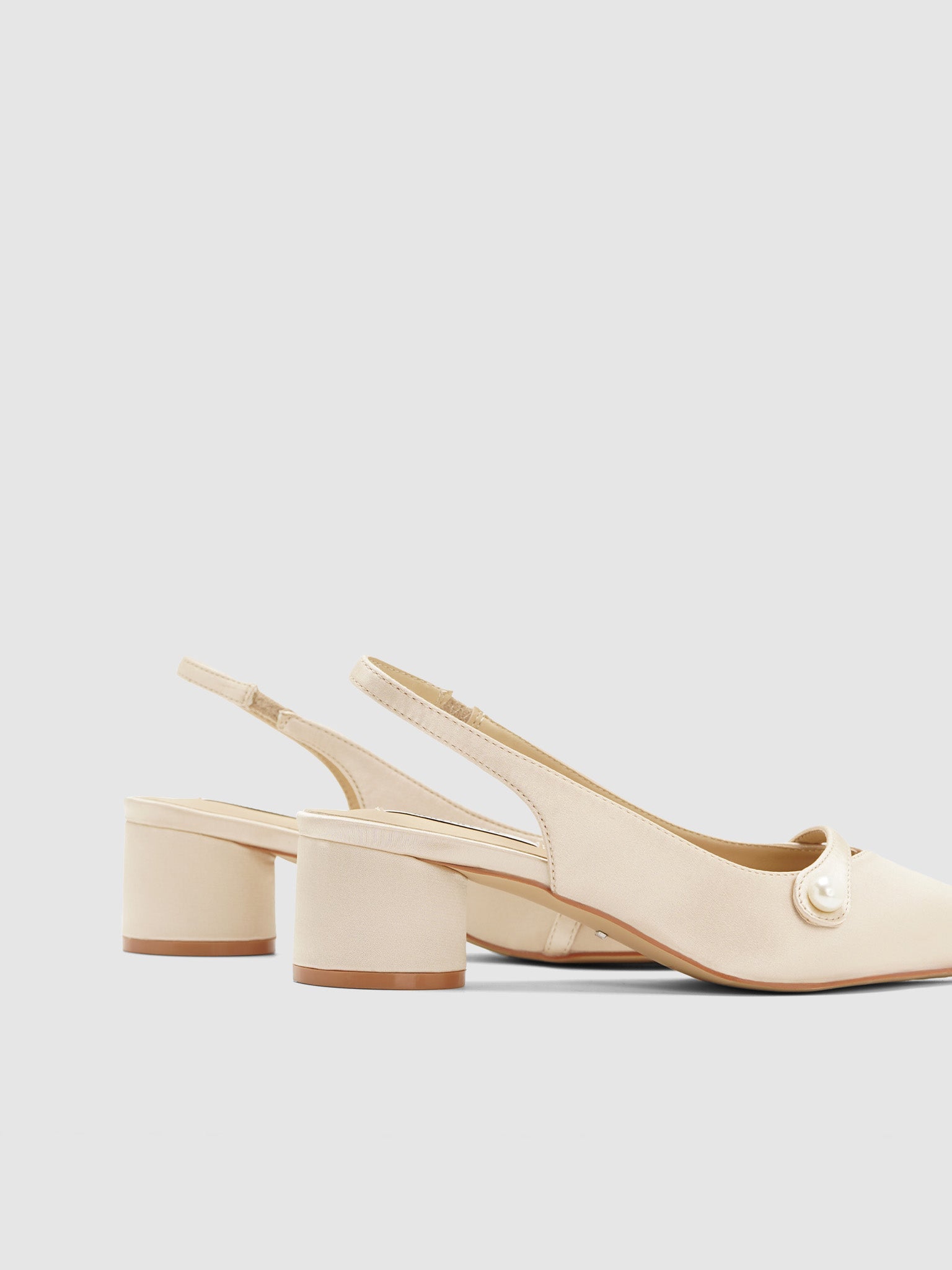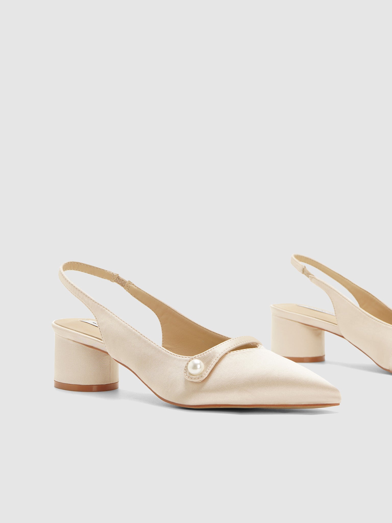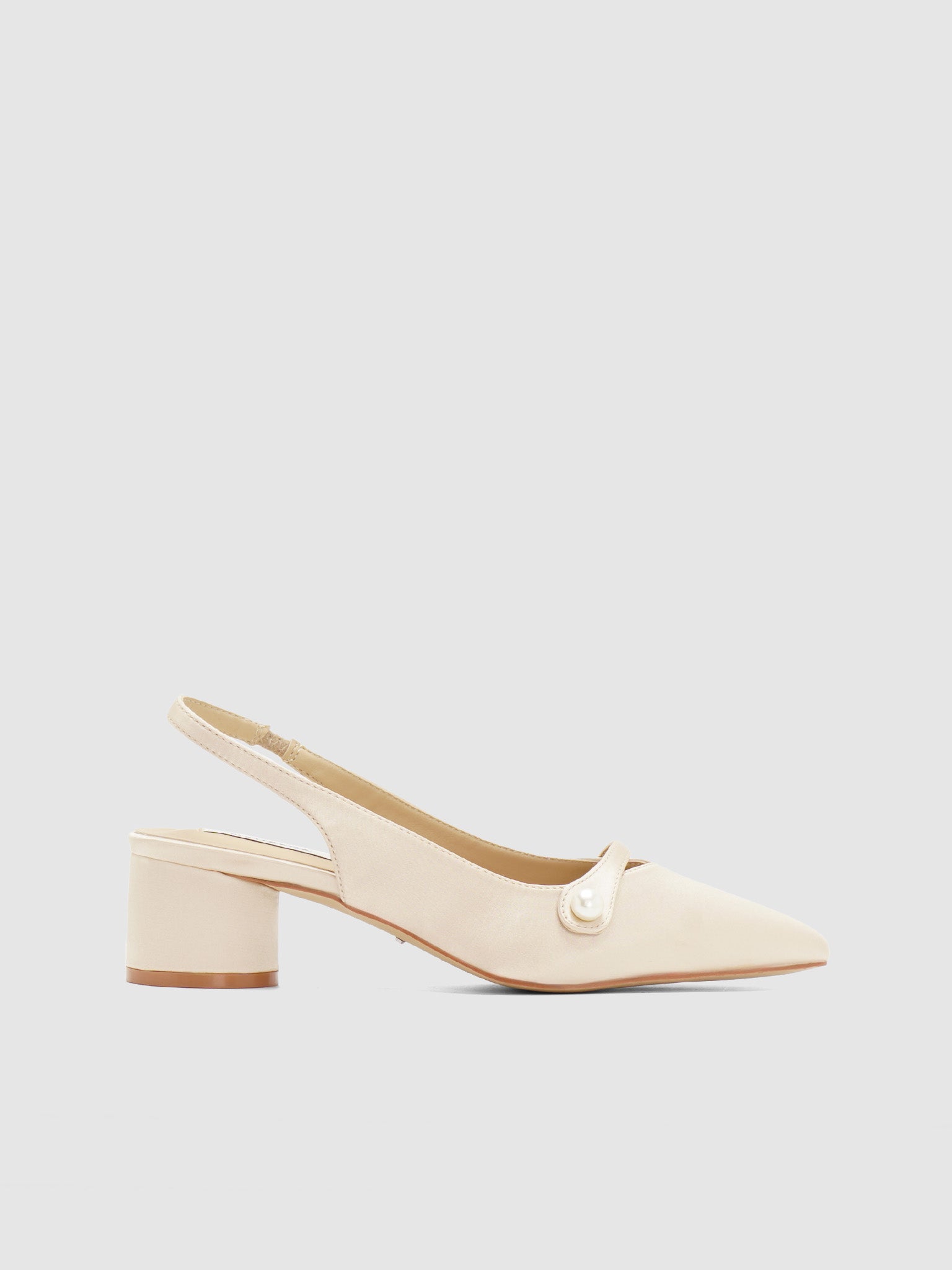 Satin sling back pumps with strap and pearl design. Has a low round block heel.