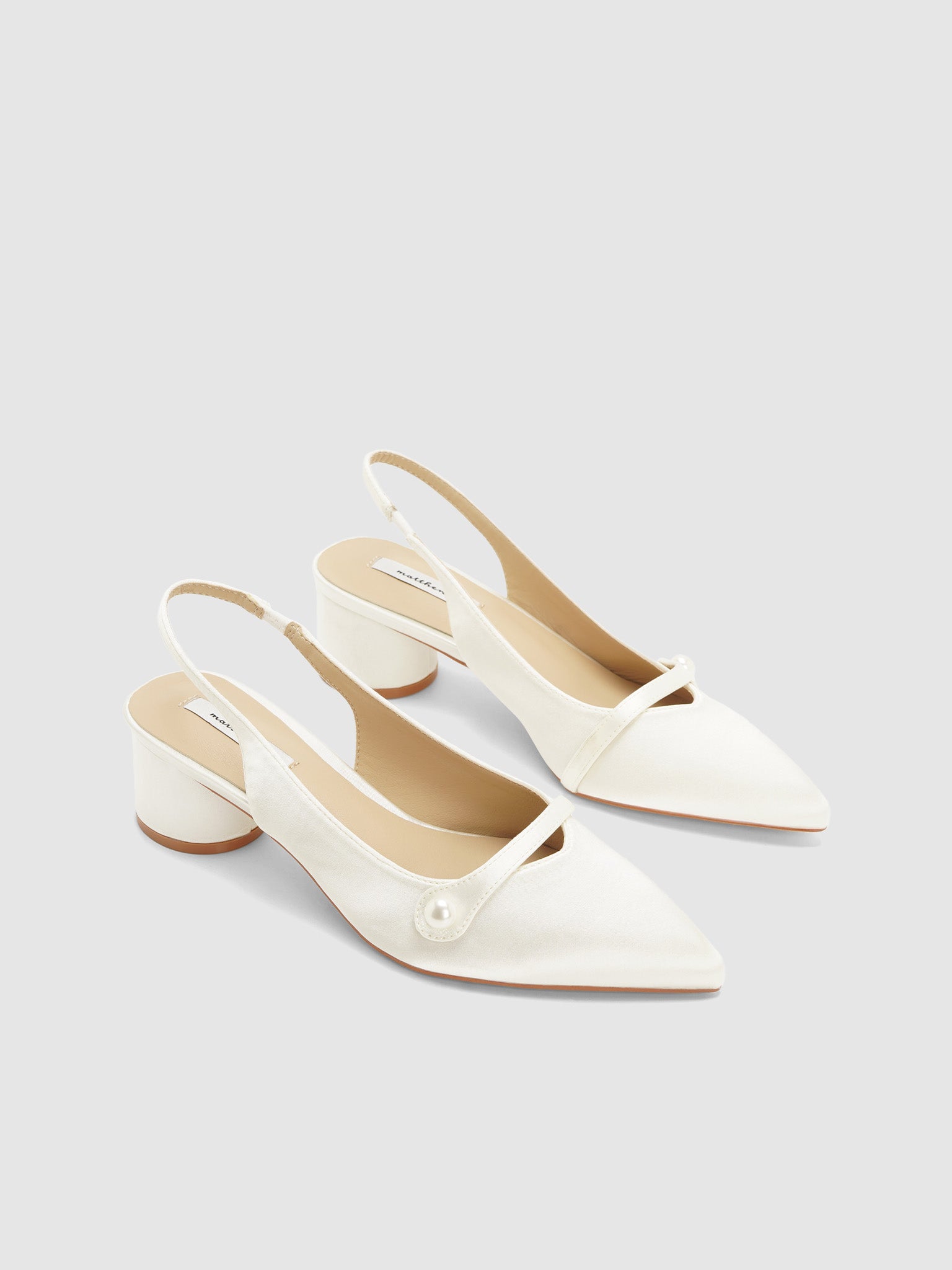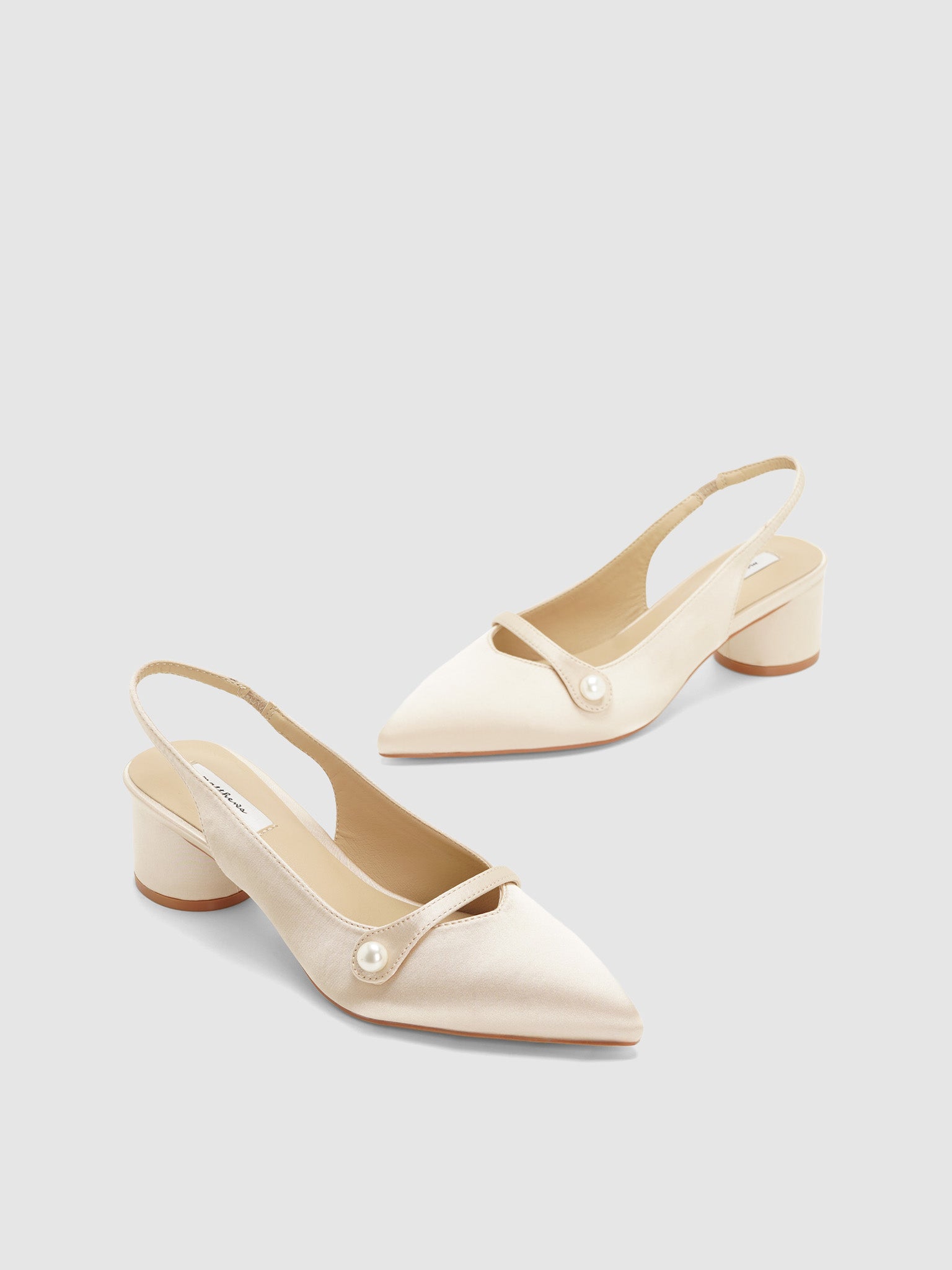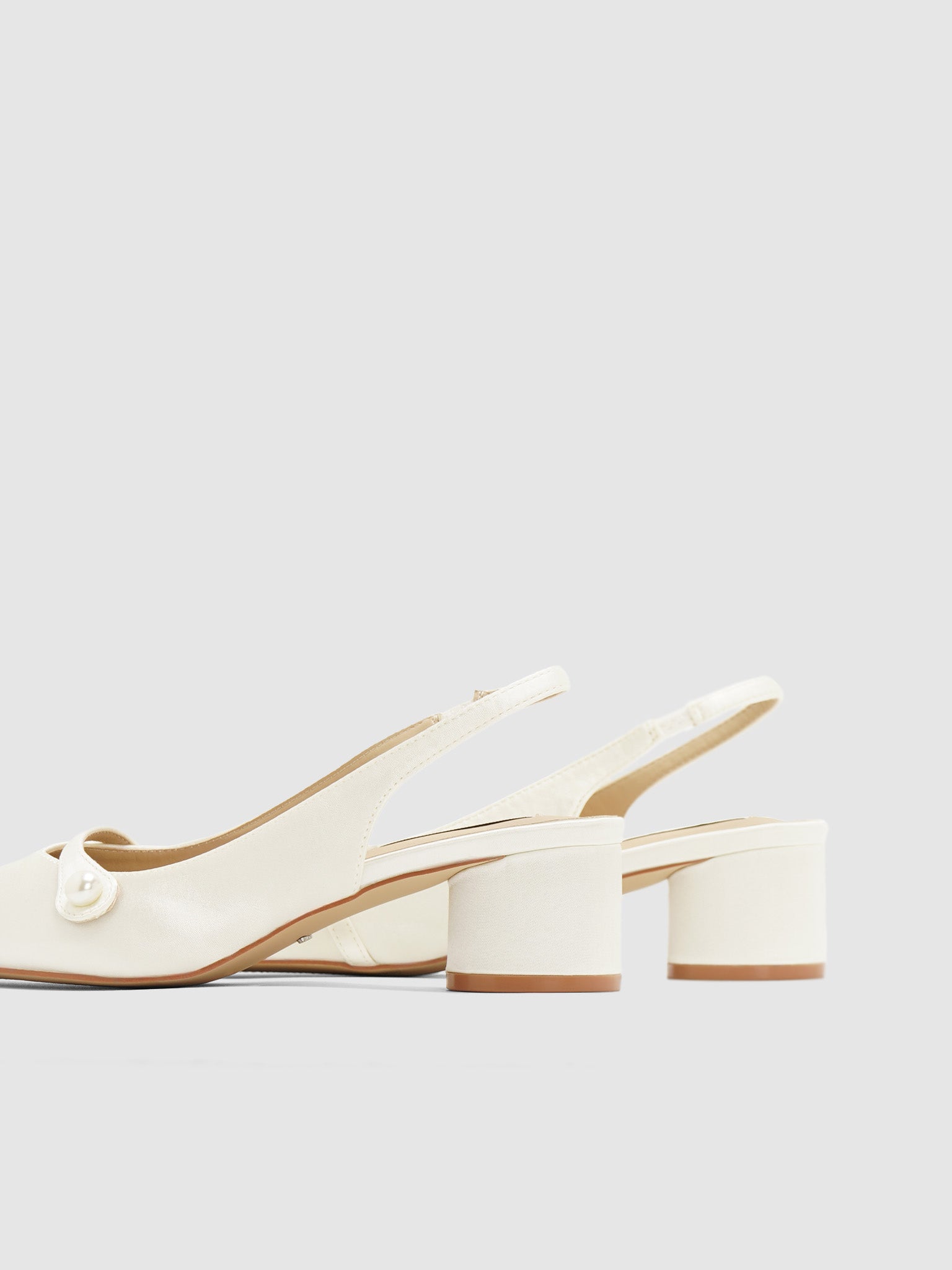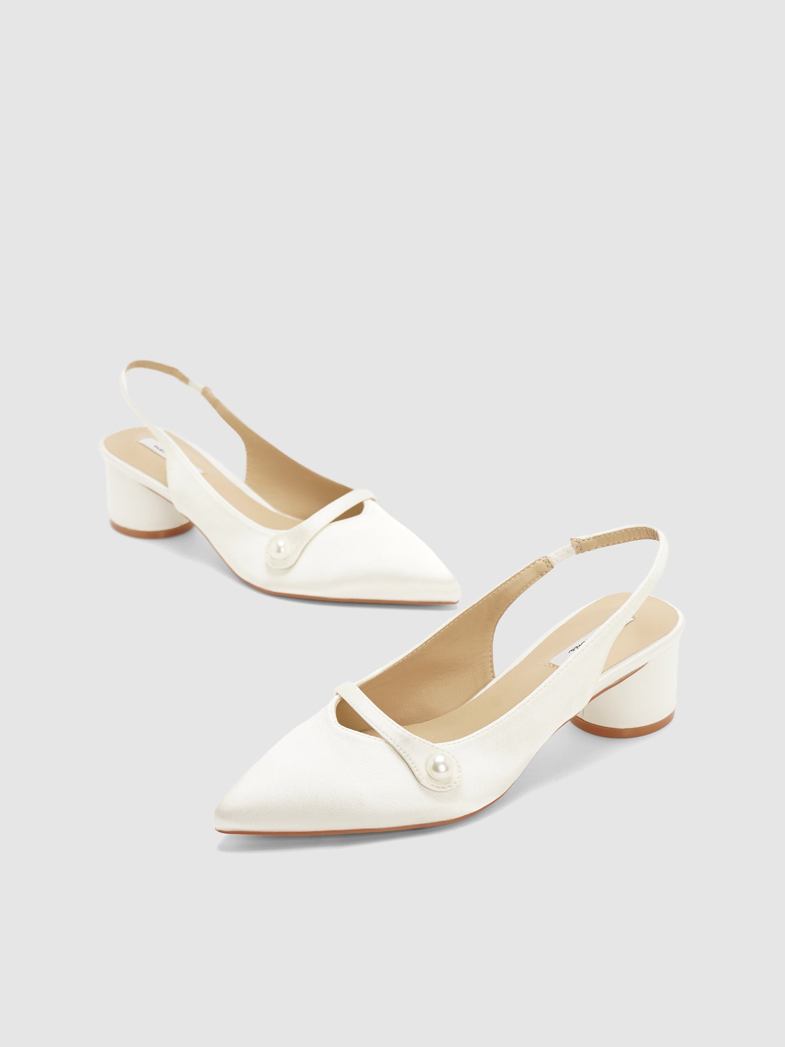 Satin sling back pumps with strap and pearl design. Has a low round block heel.