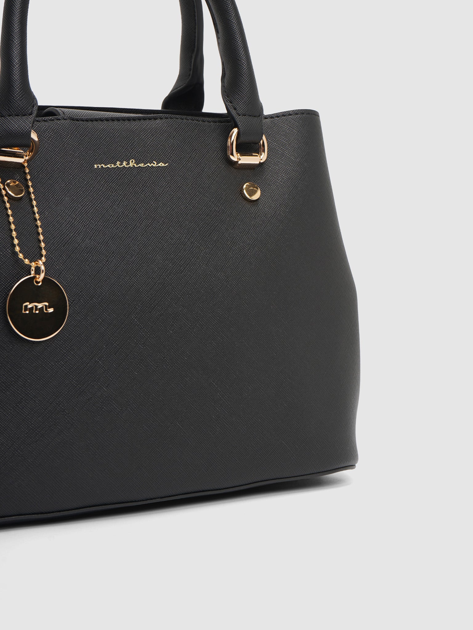 Two compartment handbag with top handles, 1 slip pocket, and magnetic snap closure. Comes with an adjustable strap, and Matthews' bag charm.